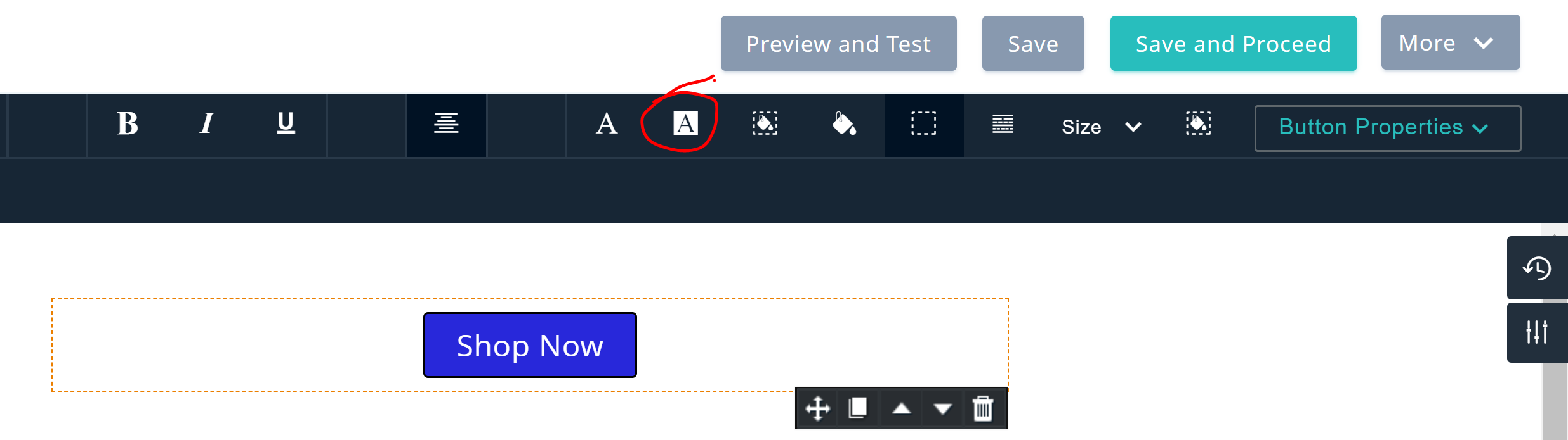 Zoho's icon for this button deviates from the conventional background color button (Bucket with a drop to the right of circled icon), so it is easy to miss this button. Having three other background color buttons as well as Button Properties menu confuses many users.