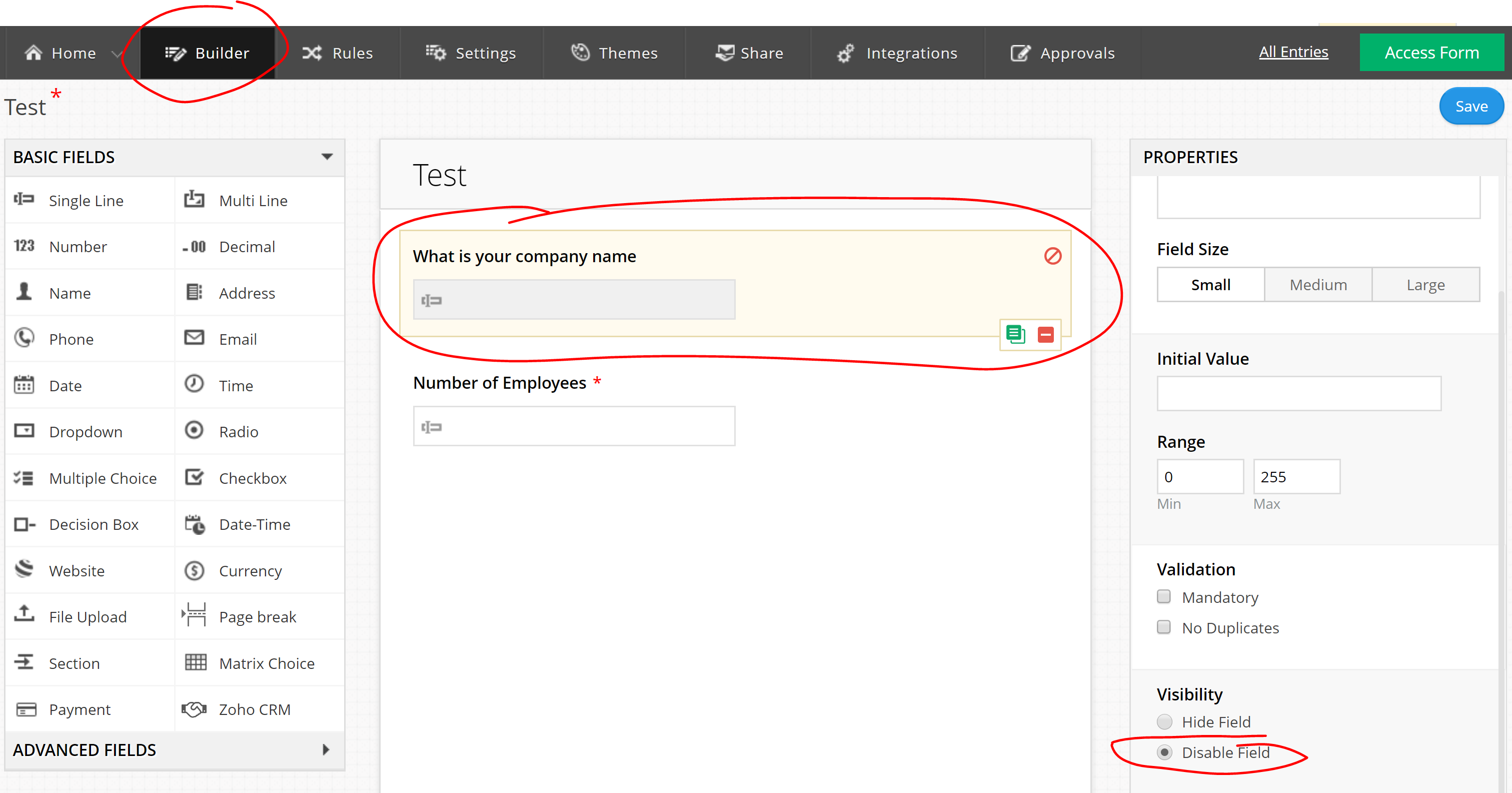 - Make sure to add ID field to the form, this field will be used to match form response to a record in CRM. Depending on the module you want to update records in this field will be different. For contact module it should be email, for Accounts module, the field should contain Account Name. You also want to disable this field in order to prevent people who fill in the form to change it. If they change the value, and it will no longer match your CRM record, and as a result the form will create new record rather than updating existing. In order to disable the field select the field in the build and click disable.
